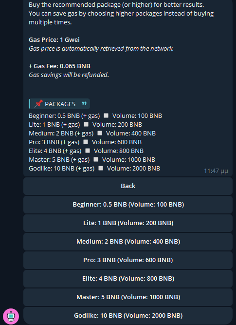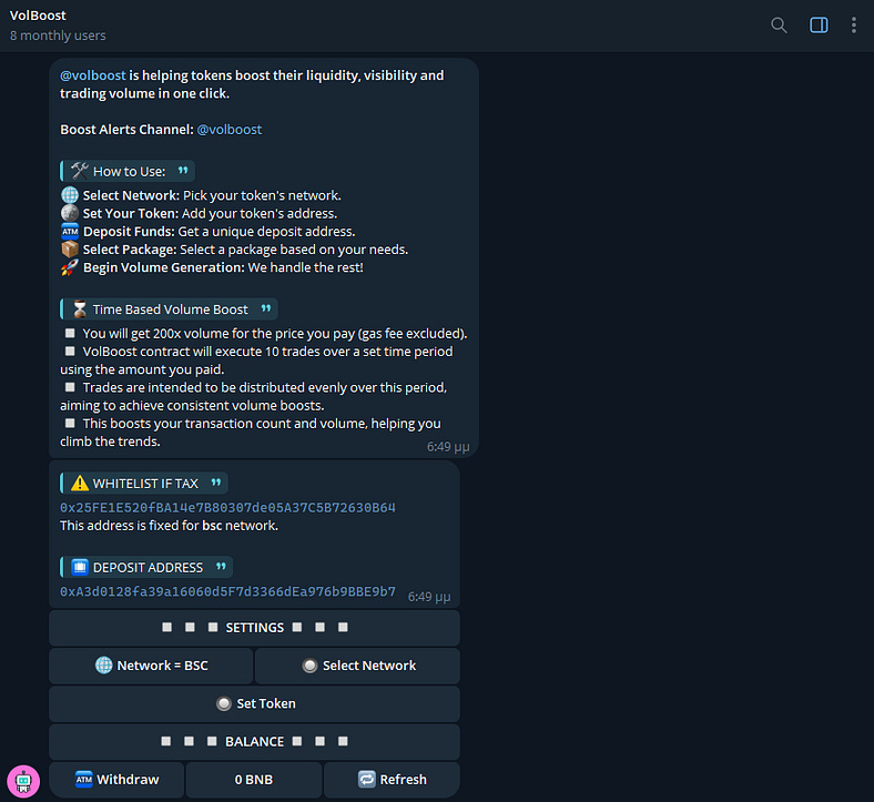 Start the Bot: Open VolBoost’s Telegram bot and select your network (e.g., BSC, Ethereum).