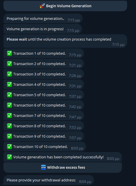 Volume Splitting: The bot breaks the total desired volume (e.g., $10k) into smaller, randomized transactions to mimic organic trading. For example: