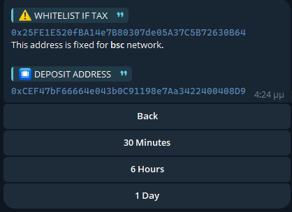 /start: Initiate the bot.Set Token: Fetch LP data from the blockchain.Set Duration: Configure transaction intervals.Deposit: Generate a wallet address for fee collection.
